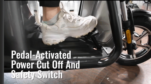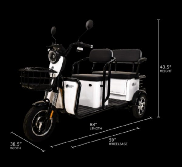 With a 26-inch seat height and a 38.5-inch width, maneuvering through tight spaces is a breeze. Enjoy up to 30 miles of adventure on a single charge, courtesy of the convenient 12v wall adapter. Plus, with a 3.3 cubic foot cargo box and additional front and rear baskets, you’ll have plenty of space for all your essentials.